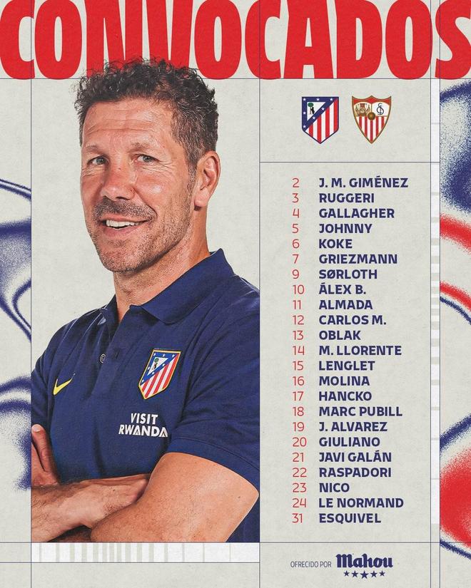 前鋒:格列茲曼、瑟洛特、巴埃納、蒂亞戈-阿爾馬達(dá)、卡洛斯-馬丁、胡利安-阿爾瓦雷斯、朱利亞諾-西蒙尼、拉斯帕多里、尼古拉斯-岡薩雷斯