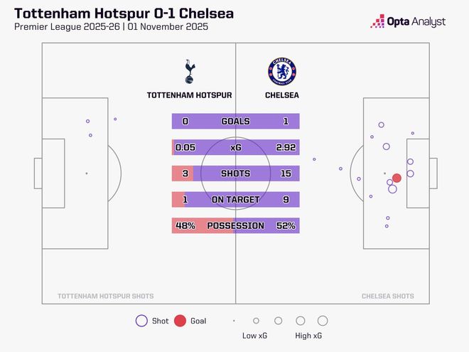 英超第10輪,熱刺主場0-1不敵切爾西,本場比賽熱刺預(yù)期進(jìn)球值僅0.05,為有統(tǒng)計(jì)以來熱刺英超單場最低。